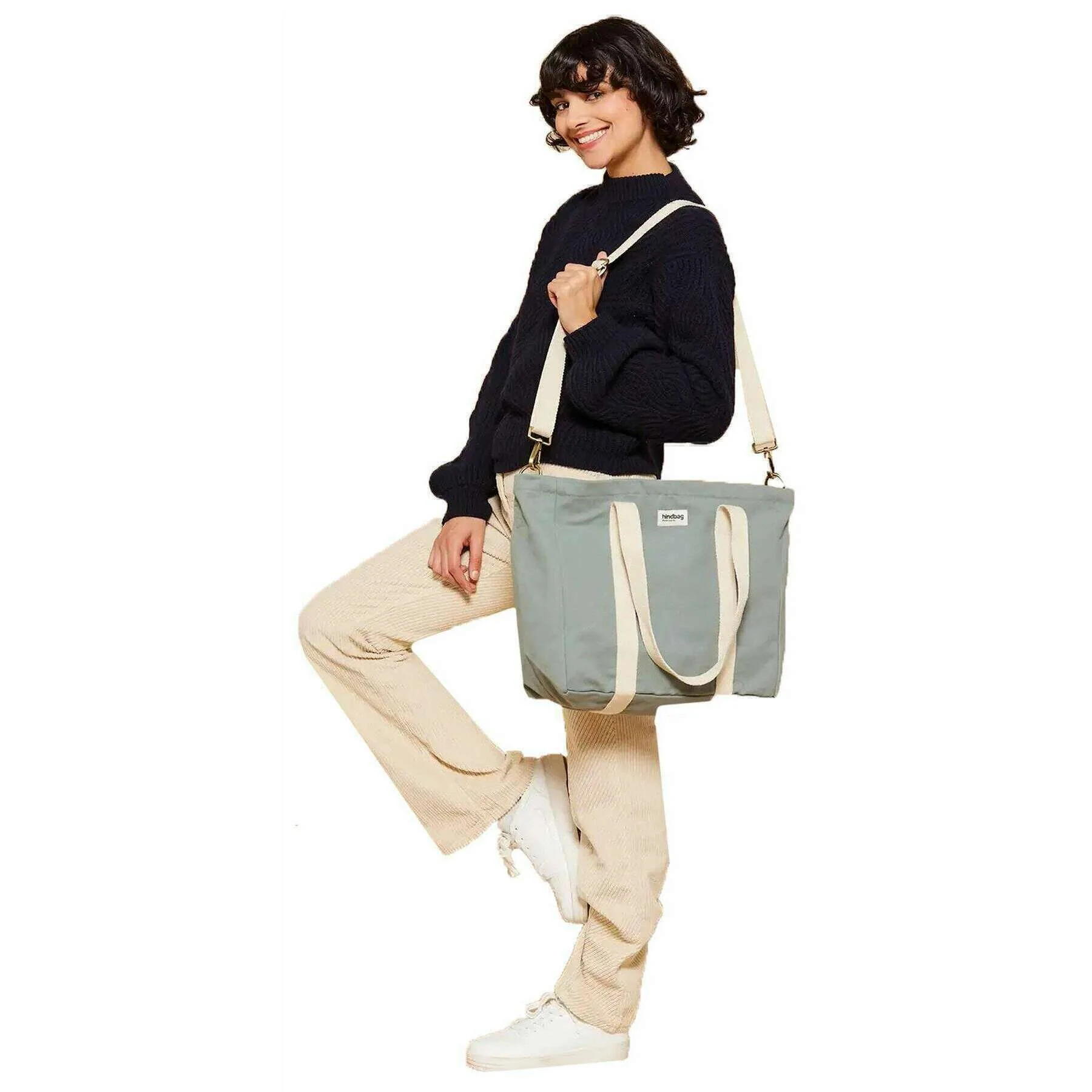 This cesar small tote bag for men or women is fashioned by the brand Hindbag in a green colour and is made from 100% organic cotton. It measures 33cm(height) x 51cm(width) x 14cm(depth). All the bags come complete with hindbag packaging. The Hindbag Cesar Small Tote Bag - Sage Blue is a versatile and eco-conscious accessory designed for everyday use. Crafted from thick, GOTS-certified organic cotton, this tote combines durability with sustainability. The spacious interior makes it ideal for carrying essentials, including a medium-sized laptop in an Ava case. Featuring a secure zip closure and an inner pocket for organization, the design of this bag allows for multiple carrying options, over the shoulder, across the body, or by hand, catering to various preferences.