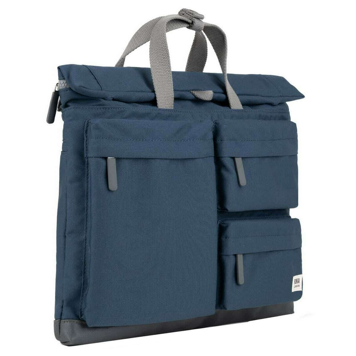 Manufactured from 100% weather resistant recycled canvas (triple coated) is this deep blue unisex blackfriars m large recycled canvas messenger bag by the designer Roka. It measures 41cm(height) x 32cm(width) x 12.5cm(depth). All the bags come complete with roka packaging. The Roka Blackfriars M Large Recycled Canvas Messenger Bag - Deep Blue incorporate all the features needed for your endeavors. This roll top messenger boasts three convenient front zip pockets and a spacious main compartment for all your essential items. Thanks to the use of recycled canvas, this bag is built to last, standing up to the wear and tear of daily use. Its lightweight design and adjustable straps also ensure comfort during long periods of use. Whether for everyday use or special occasions, this bag is a durable and responsible addition to any wardrobe.